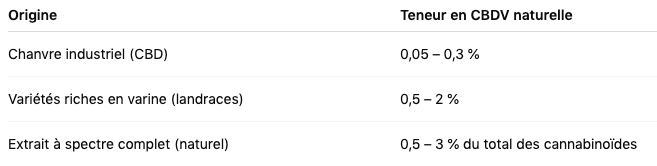 | CBDV | Naturelle | Quelques études | Faible | Accepté à l’état naturel |